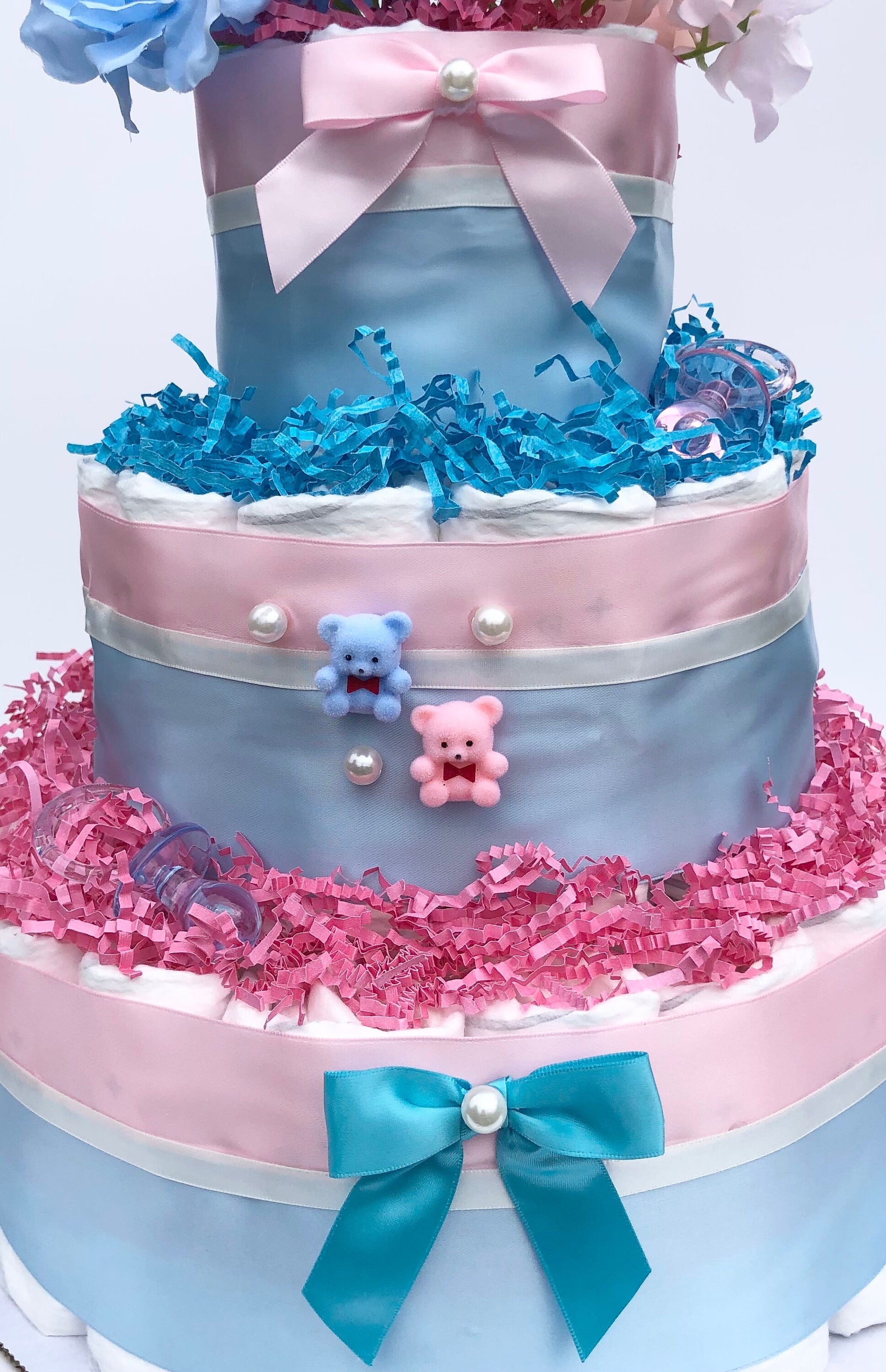 🔸 This adorable and elegant Gender Reveal customized 3 Tier Diaper Cake is one-of-a-kind gift for baby showers, welcome home/baby gift, centerpiece or just tokens of love for loved ones and babies.