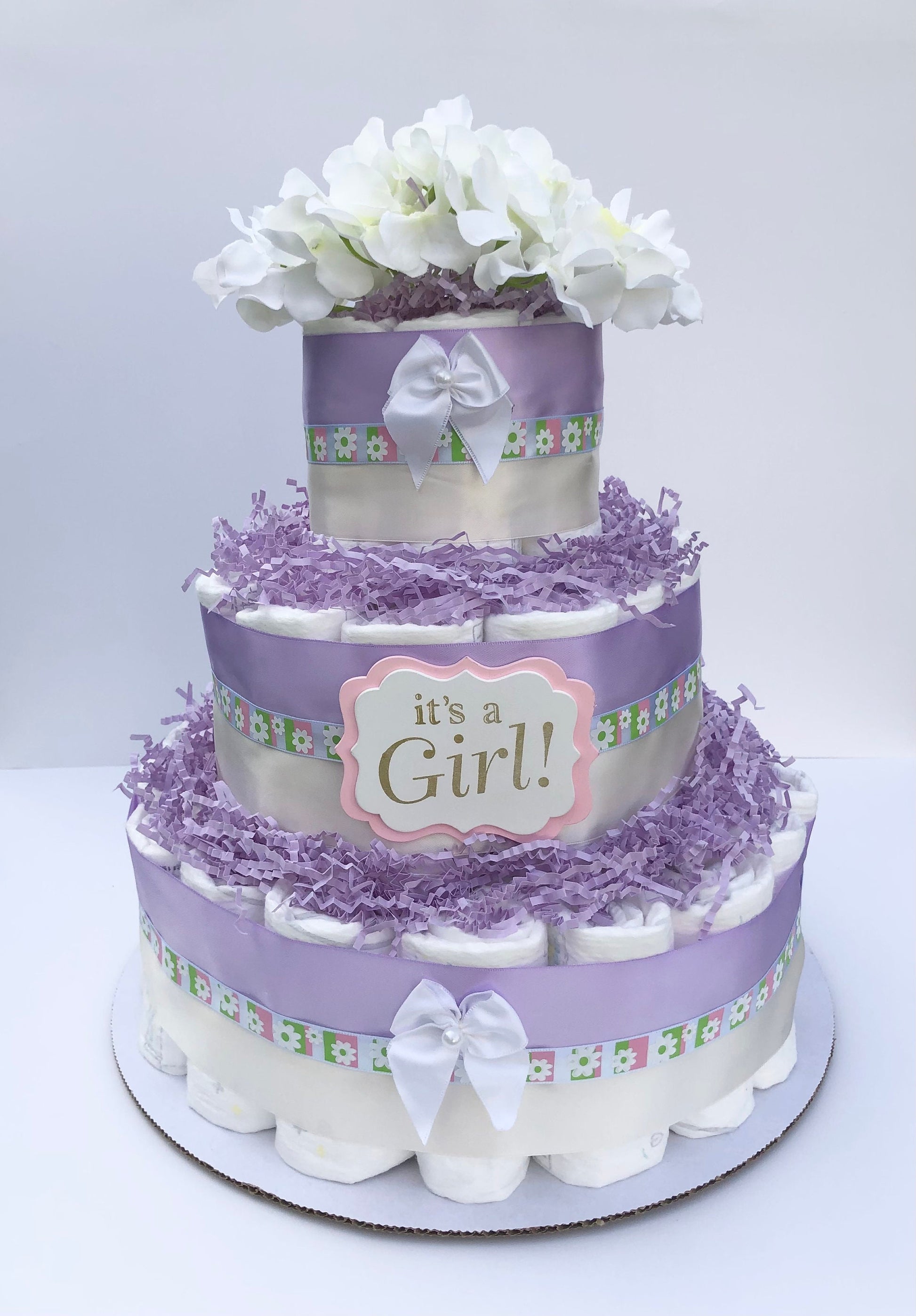 Diaper Cake 3 Tier,Lavender Style, Baby Girl, Baby Shower Centerpiece Decor Gift, Neutral, Practical Handmade Gift